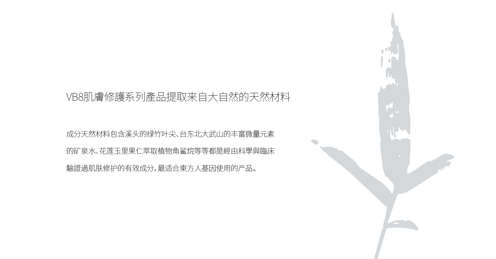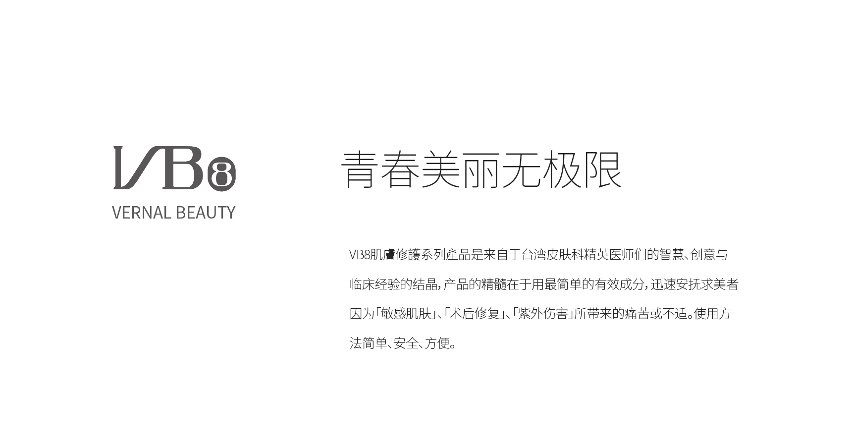 在現代社會高度文明發(fā)達與互聯網日益革新變化的大時代,VB8對美的無窮探尋繼承發(fā)揚,VB8肌膚修護系列產品提取臺灣天然材料,用最簡單的有效成分迅速安撫求美者因為肌膚敏感、紫外線傷害所帶來的的痛苦,致力于發(fā)掘適合東方人基因使用的產品。