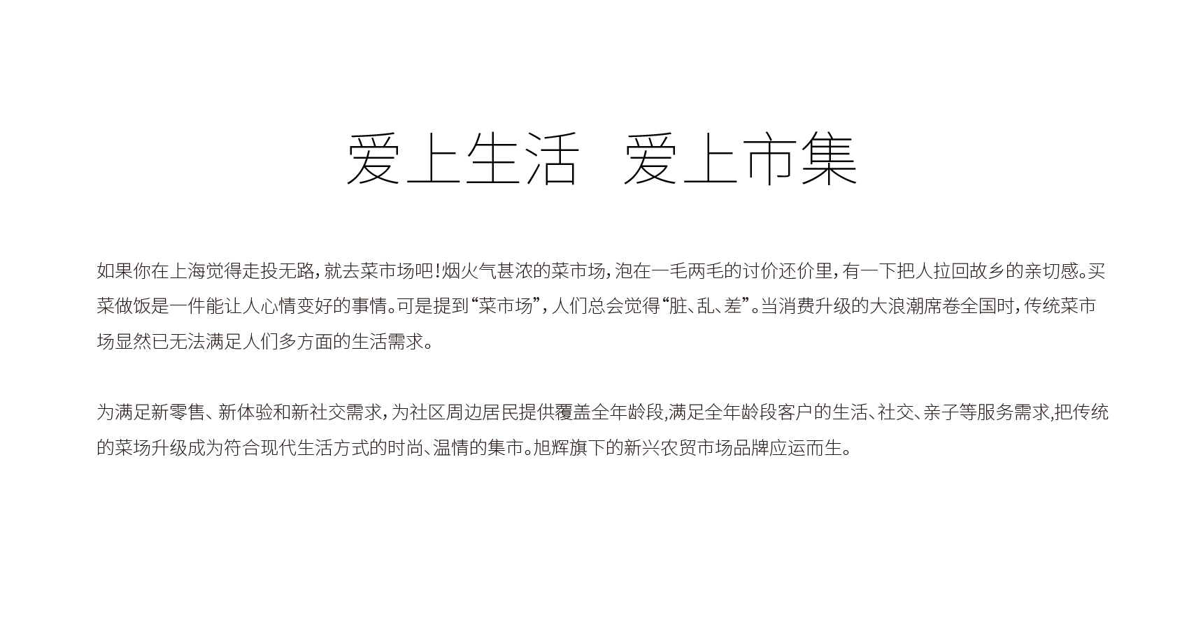 為滿足新零售、新體驗和新社交需求的社區級商業場所。為社區周邊居民提供服務,幵覆蓋全年齡段,滿足全年齡段客戶的生活、社交、親子等服務需求,把傳統的菜場升級成為符合現代生活方式的時 尚、溫情的集市。目標是打造“網紅”集市,成為上海地標項目。社區型農貿市場可進行多元化業態組合,為社區居民提供一個兼具購物、休閑、娛樂、教育文化、聚會社交等多重功能的生活樂園,充分展現社區農貿市場的“一站式服務體驗”。