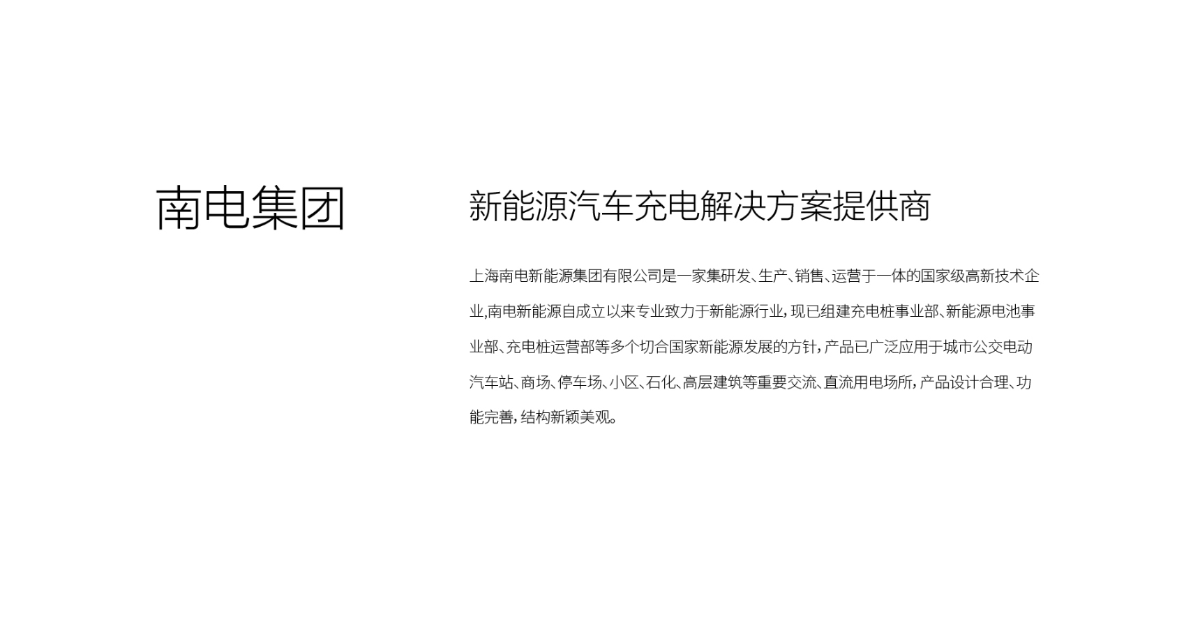 上海南電新能源集團有限公司是一家集研發、生產、銷售、運營于一體的國家級高新技術企業,南電新能源自成立以來專業致力于新能源行業,現已組建充電樁事業部、新能源電池事業部、充電樁運營部等多個切合國家新能源發展的方針。