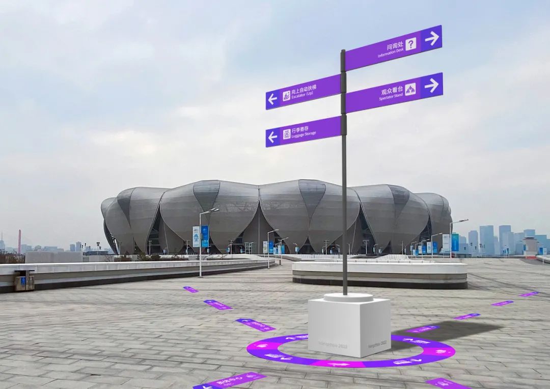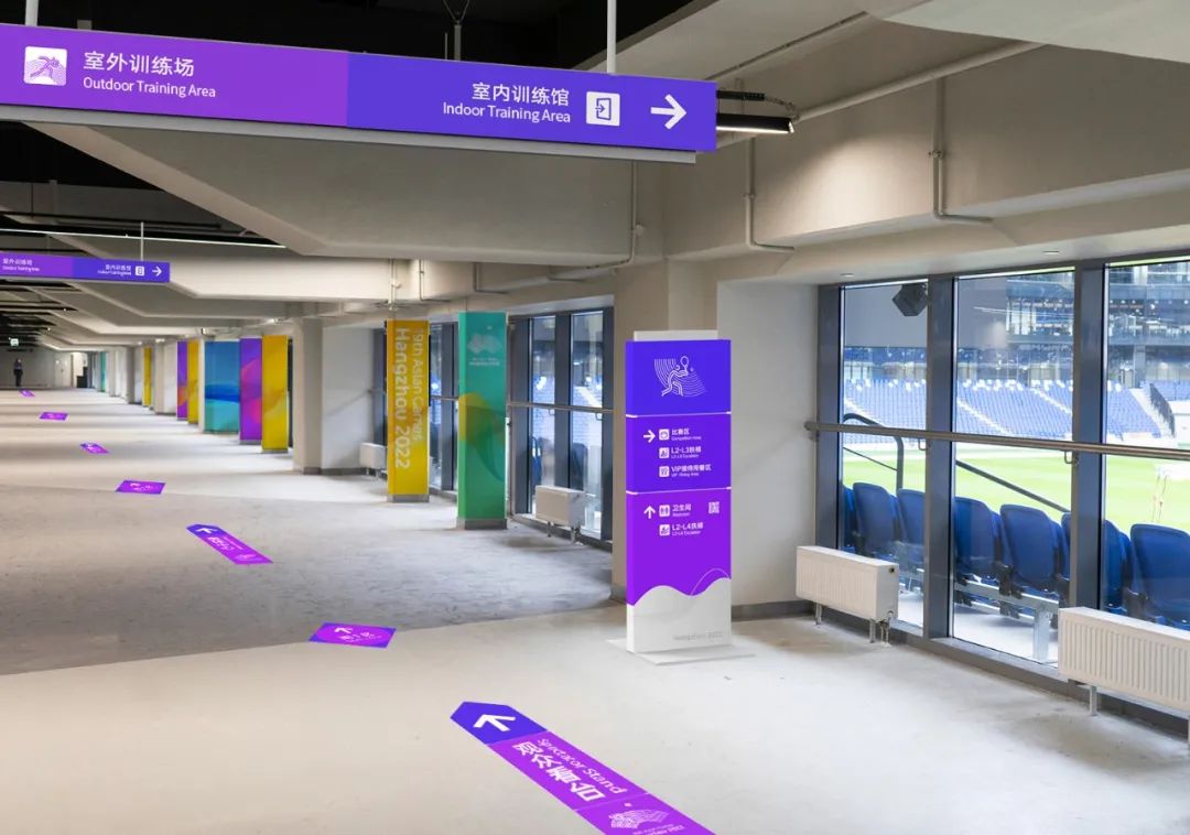 據(jù)官方介紹:此次發(fā)布的引導(dǎo)標(biāo)識(shí)系統(tǒng)基礎(chǔ)元素設(shè)計(jì),在色彩上采用了杭州亞運(yùn)會(huì)色彩系統(tǒng)中的“虹韻紫”為主色調(diào);圖標(biāo)、符號(hào)和裝置造型的設(shè)計(jì)靈感則來(lái)自“良渚玉琮”和“錢(qián)江浪潮”。在設(shè)計(jì)說(shuō)明中還提到:指示牌通常有四個(gè)面,象征玉琮的八個(gè)方向,寓意“禮迎八方”;同時(shí)以漸進(jìn)式色階區(qū)分玉琮的“節(jié)”,并將導(dǎo)引信息分區(qū)分層編排,每一節(jié)正好可以說(shuō)明一個(gè)信息,寓意玉琮一節(jié)一節(jié)造型的“?節(jié)節(jié)攀升”內(nèi)涵。