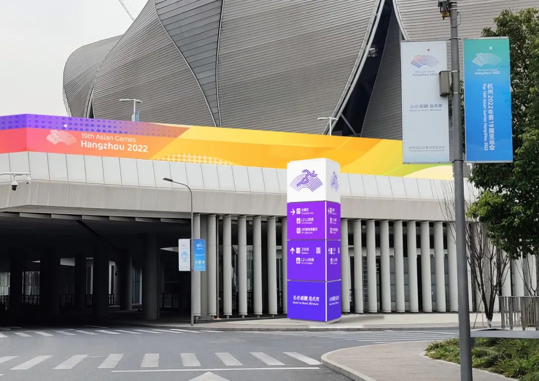 杭州亞運(yùn)會(huì)、亞殘運(yùn)會(huì)引導(dǎo)標(biāo)識(shí)系統(tǒng)基礎(chǔ)元素重點(diǎn)圍繞場(chǎng)館側(cè)進(jìn)行設(shè)計(jì),包括車輛交通標(biāo)識(shí)、行人導(dǎo)向標(biāo)識(shí)、功能區(qū)域標(biāo)識(shí)、公共信息標(biāo)識(shí)等。