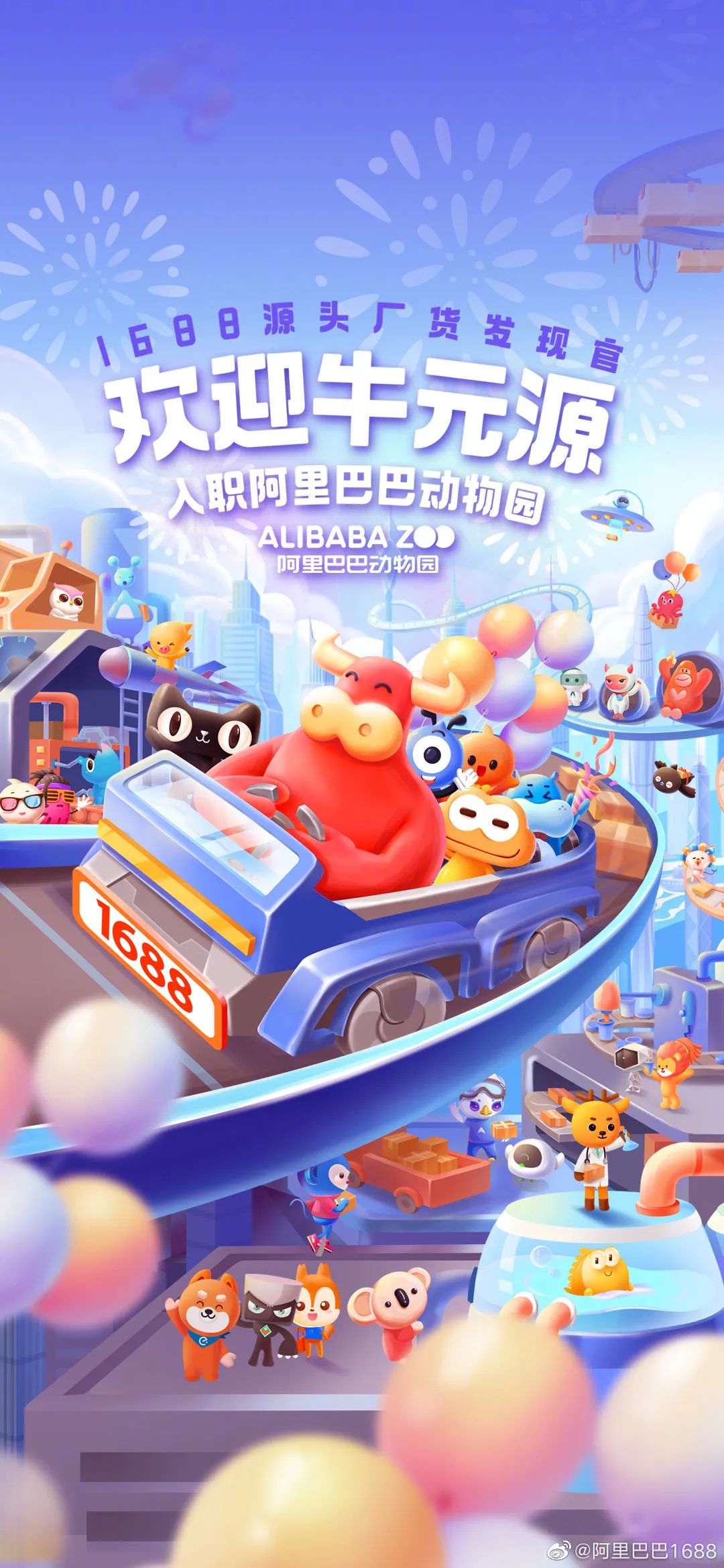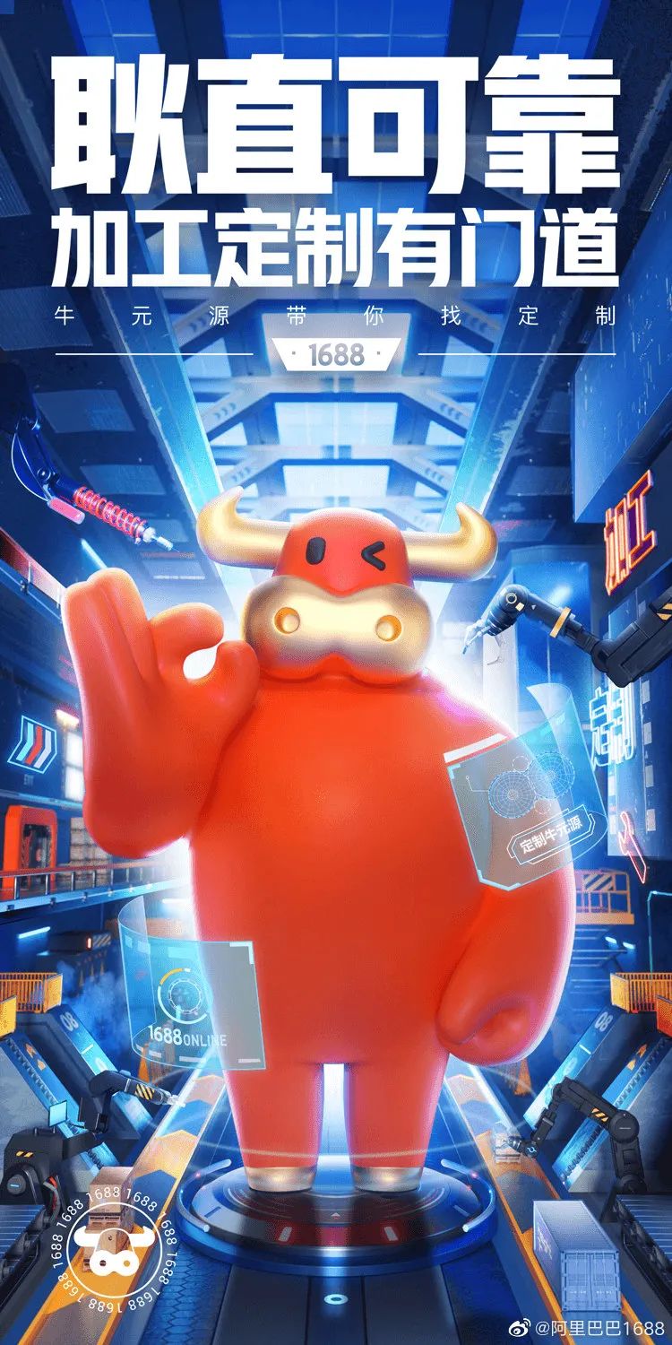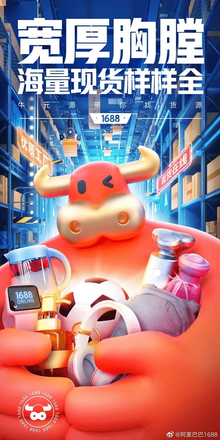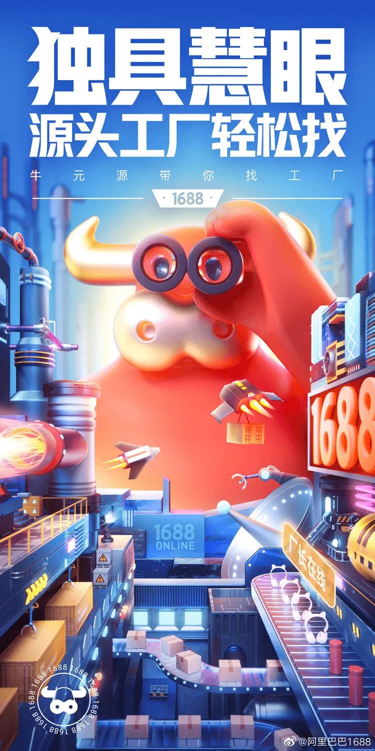 3月底,阿里巴巴的“1688”也推出了吉祥物,1688的定位也是“低價、源頭貨”,“1688源頭貨發(fā)現(xiàn)官”——牛元源,8字鼻,金牛角,寬厚肩膀,看著就很招財?shù)臉幼?/p>