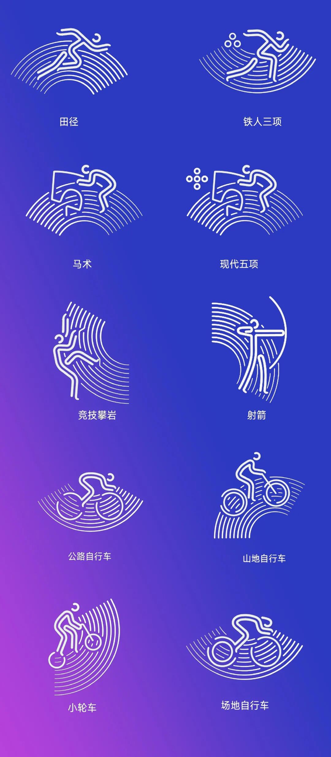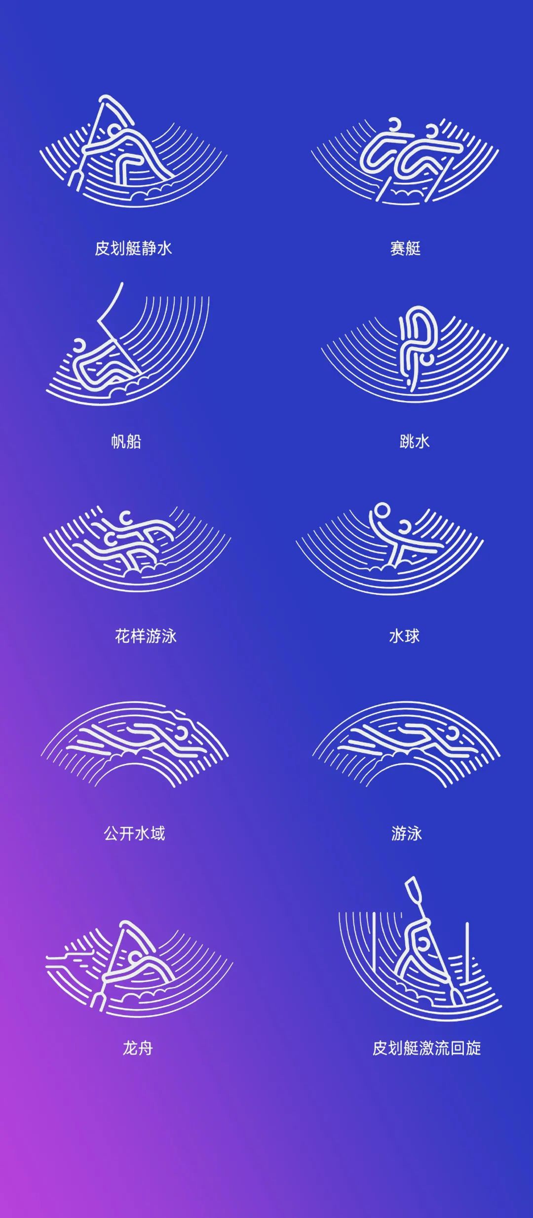 之后設計師又發布了一系列體育圖標,下面的這些圖花費了9個月的制作時間,保證每一個體育圖標都像是在扇形的水波紋上“運動”。