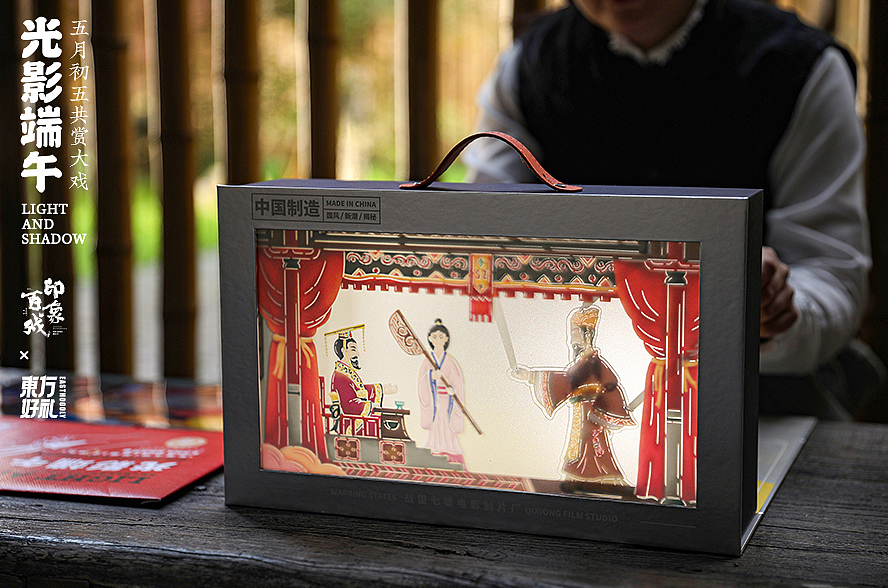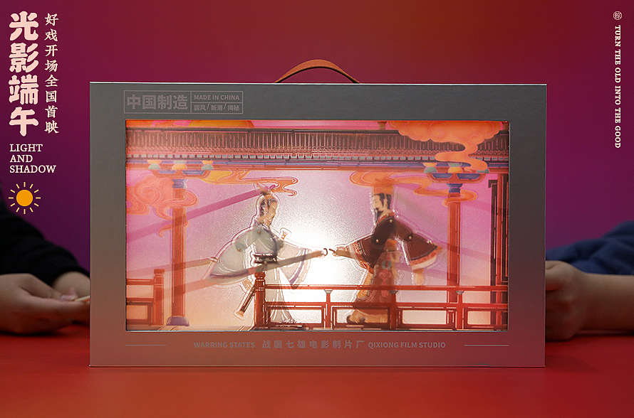 有別于傳統意義上的端午禮盒設計,整體是一個戲臺的造型,當緩緩“拉開大幕”,登場的便是,中國民間古老的傳統藝術之一--皮影戲