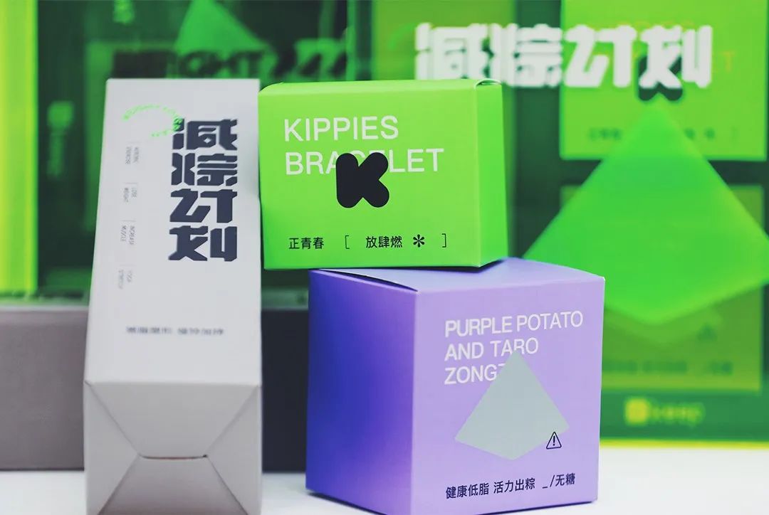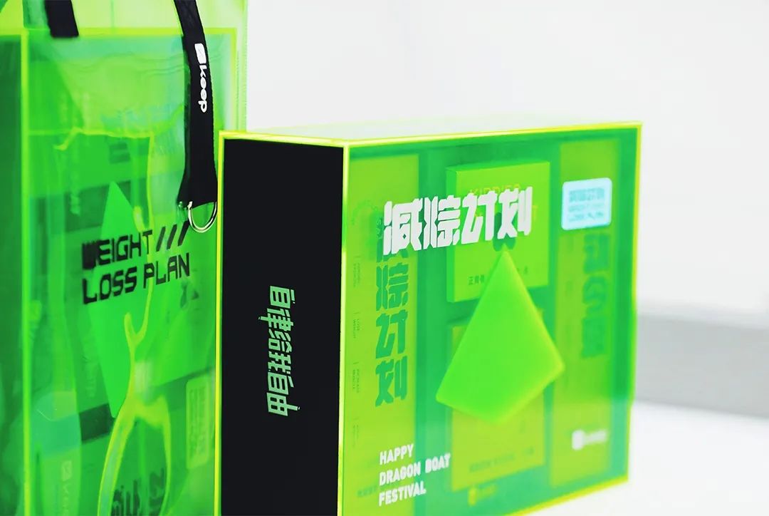 keep的禮盒用了亮眼的熒光綠,字體設(shè)計(jì)也十分有力量,“減粽計(jì)劃”顧名思義“減重計(jì)劃”,真是暗戳戳的在凸顯自己的企業(yè)品牌